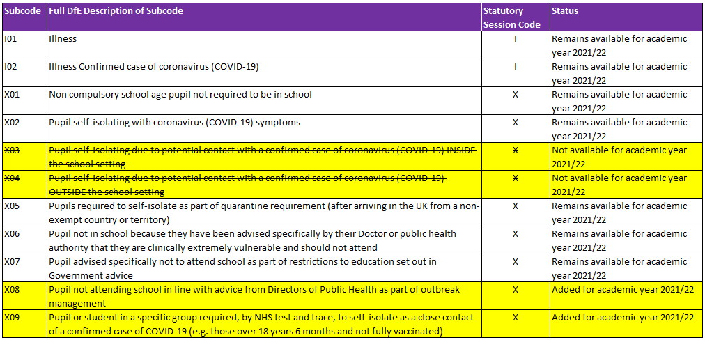The changes to attendance subcodes have been confirmed by the DfE and are intended to help schools cope with changes to the education settings status form for the 2021/22 academic year.