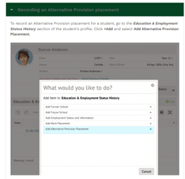 To record an Alternative Provision placement for a student, go to the Education & Employment Status History section of the student profile. Click +Add and select Add Alternative Provision Placement.