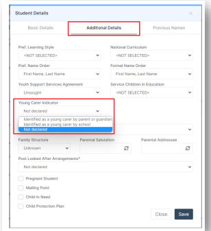 This item records whether the pupil has been identified as a young carer and by whom. The Young Carer indicator is found in Students>View Student Details>Edit Student Details.