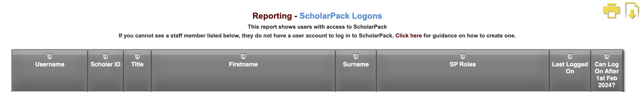To do this, you can use the ScholarPack Users report. It will show you all staff who have a login, plus a new Can Log On After 1st Feb 2024? column.
