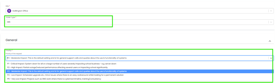 When you log a ticket via the customer portal, select the Ticket type either MIS or Technical to ensure it gets to the right team. The Priority, if you have an urgent ticket, MIS down for example please select either P1/P2 all other tickets default to P3 or even P4 if not urgent.