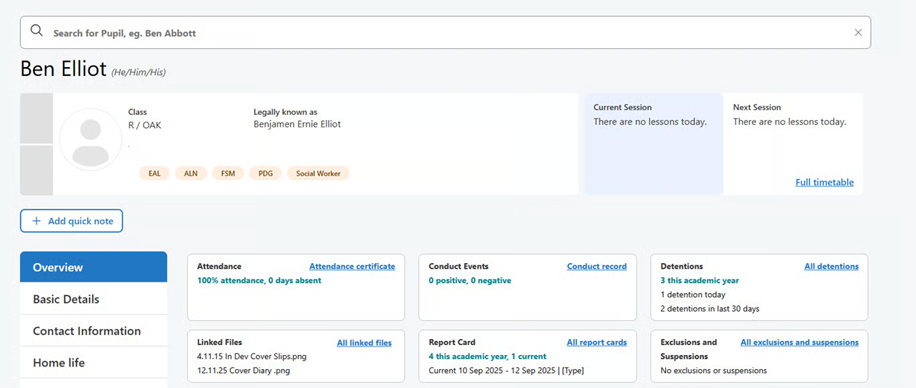 The Pupil Overview brings information about a child together from across NG providing a holistic view of a child’s data. The first version of this which will be available to schools includes Attendance and Conduct Data as well as a visual of a pupils timetable. The links within the overview will take you through to that child’s information within the other areas of Next Gen. Additional areas will be added over time.