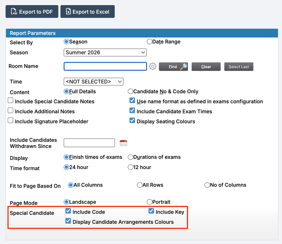 - Include Code – Displays the Special Candidate Requirement codes next to each student in the report.