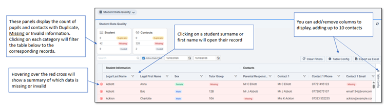 The Student Data Quality dashboard highlights missing, invalid, or duplicate information so you can correct it quickly.