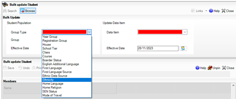 It’s never too early to start checking your data! You can do this at any time in SIMS and one of the particularly useful areas for this is the Bulk Update option. This can be accessed via Routines | Pupil (or Student) | Bulk Update. Once in here, choose the Group Type first, e.g. Ethnicity: