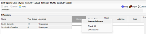 Then, select your Group and scroll all the way to the bottom of the list and select ‘<NONE>’ first, and then over to the Data Item and again select Ethnicity and Search. This will bring up a list of pupils with no Ethnicity. Simply tick the relevant box for the pupil concerned. To make the columns narrower, right click on the column header and select ‘Narrow Columns’: