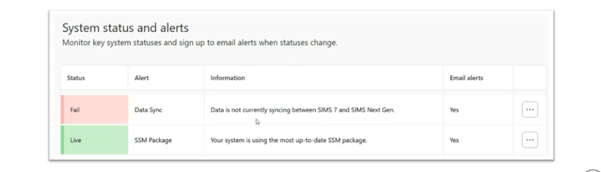 You can also keep up to date with system status and alerts from within the Next Gen admin console to ensure your system is syncing successfully. This component notifies the school if the synchronisation between SIMS 7 and Next Gen has stopped working and confirms that the SIMS Service Manager (SSM) is up to date.