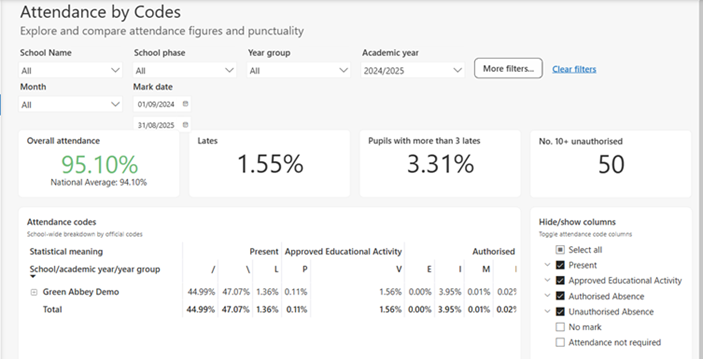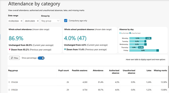 Attendance by category: view overall attendance, authorised and unauthorised attendance, late and missing marks.