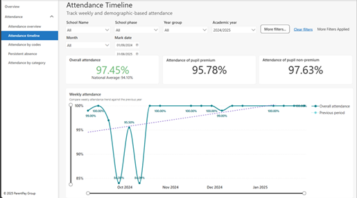 Attendance timeline: can look at attendance of different demographic information e.g. enrolment status, SEND, PP, ethnicity