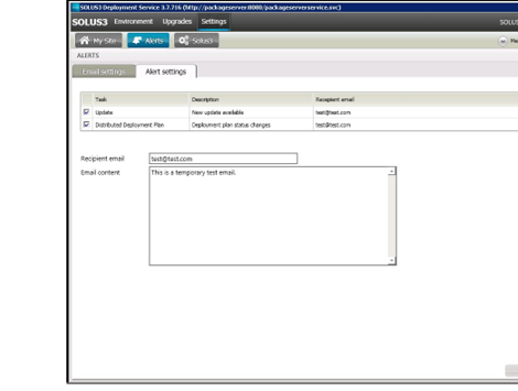 The ALERTS page enables Deployment Managers to set up SOLUS3 to send emails when certain SOLUS3 events occur. Such events are configurable in the Alert Settings tab.