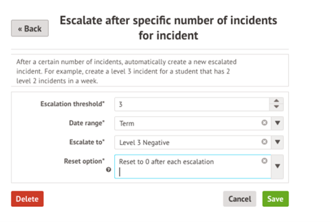 Did you know that by using Behaviour workflows in Arbor you can set to incidents to escalate to the next severity level automatically by setting a threshold? This will escalate if more than one of your chosen number of incidents is logged within a 7/14/month or termly period. See this article here for more information. Setting up Behavior Workflows