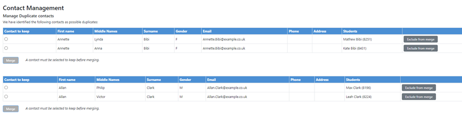 Here you will see all the duplicate records you have for each contact as they are grouped by name. Siblings need to be linked to the same contact details rather than a separate contact record set up for each one.