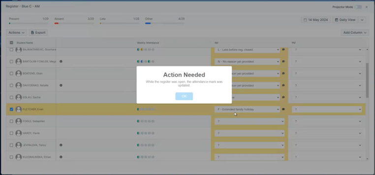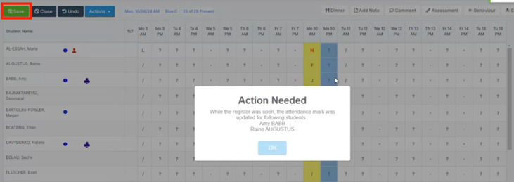 In Primary photo view and Secondary (old UI) registers the validation check will be performed each time the user clicks the Save button and the notification will read ‘While the register was open, the attendance mark was updated’ and will list the Student names that have an existing Protected Mark: