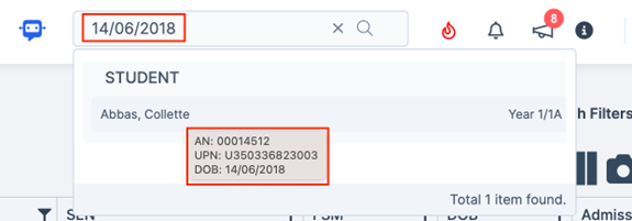 Entering the Date Of Birth in DD/MM/YYY format will return matching values. Hovering over the results will display the Admission Number, UPN and DOB for matching Students.
