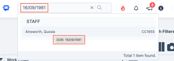 Entering the Date Of Birth in DD/MM/YYY format will return matching values. Hovering over the results will display the DOB for matching Staff.