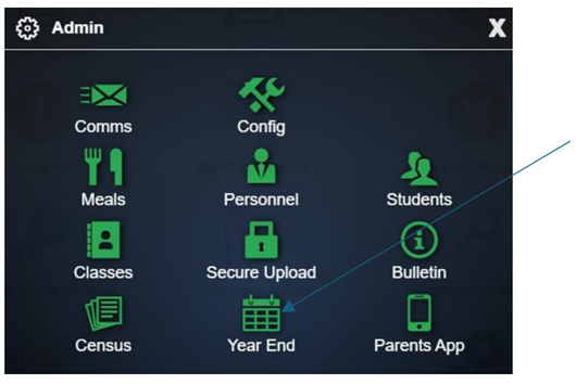 - Select a new school year (that you will have created before running the Year End in the School Diary) that will be the new current school year.