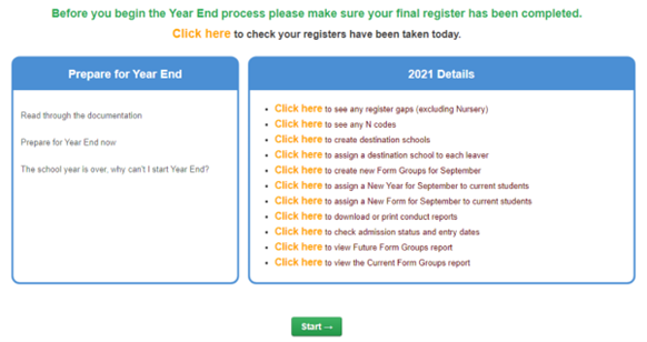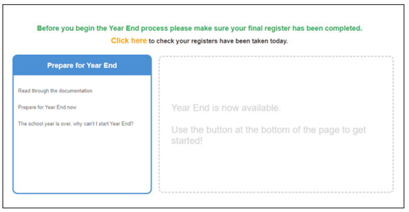 The earliest date you can run the End of Year process is the last day of the summer term / current academic year, after the last attendance session has been recorded.