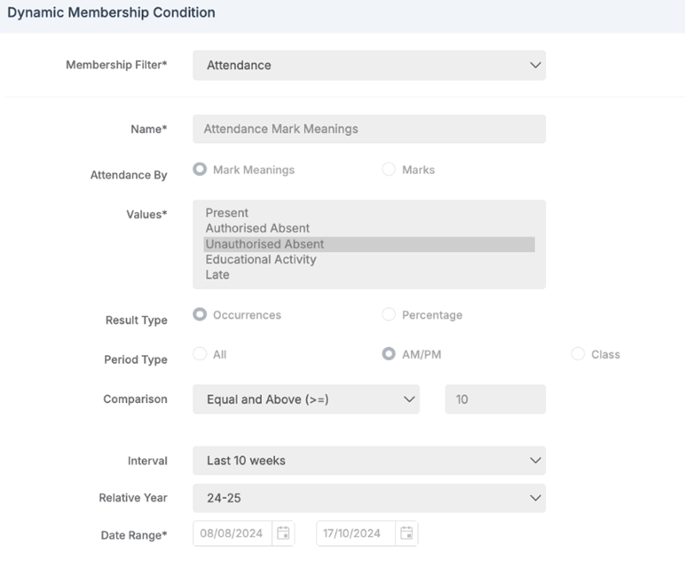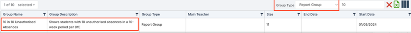 Option 2 Similar to option 1, a tile will be added to the Attendance dashboard showing students with 10 unauthorised absences. The tile will also work using the date option in settings. When a period greater than 10 weeks such as year to date is selected, this option will calculate all unique combinations of 10 rolling weeks within the selected weeks.