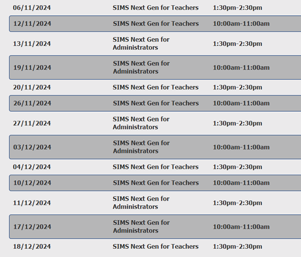 | SIMS Curriculum Management using NovaT | Tuesday 26th November (4 Days) | https://www.schoolicts.co.uk/events/nova-t-online/?occurrence=2024-11-26&time=1732613400 |