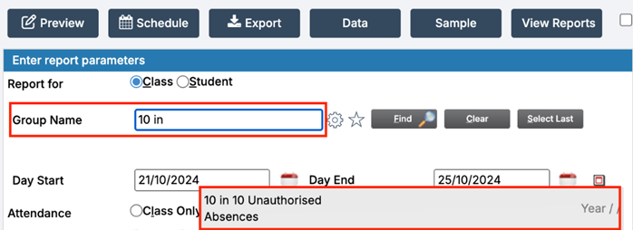 Search for the Report Group name in the Group Name field and then select it from the list. Click Preview to run the report.