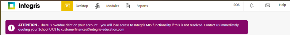 If you are alerted by a banner at the top of Integris such as below please look to resolve any overdue debt on your account. However if you have any queries about this matter please contact customerfinances@integris-education.com