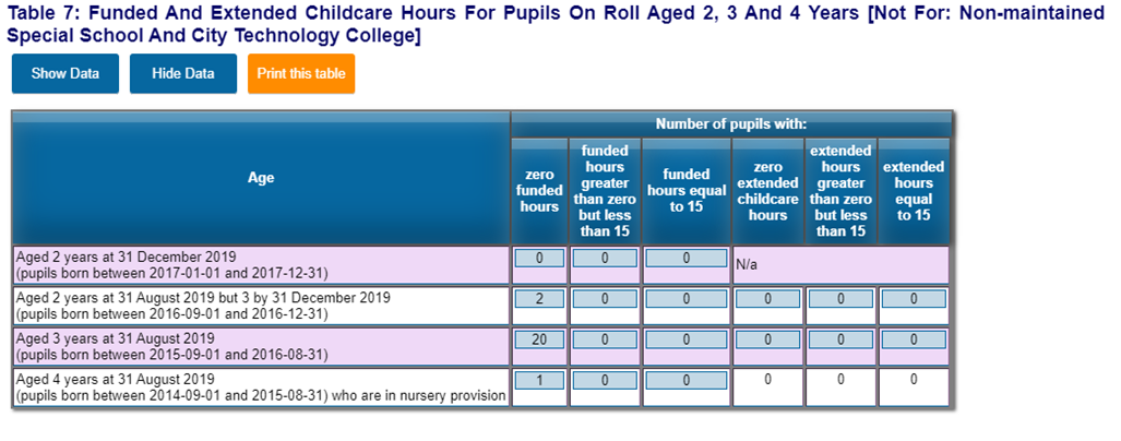 Table 7 in the Census displays data for Funded and Extended Childcare Hours for pupils on roll aged 2, 3, and 4 years